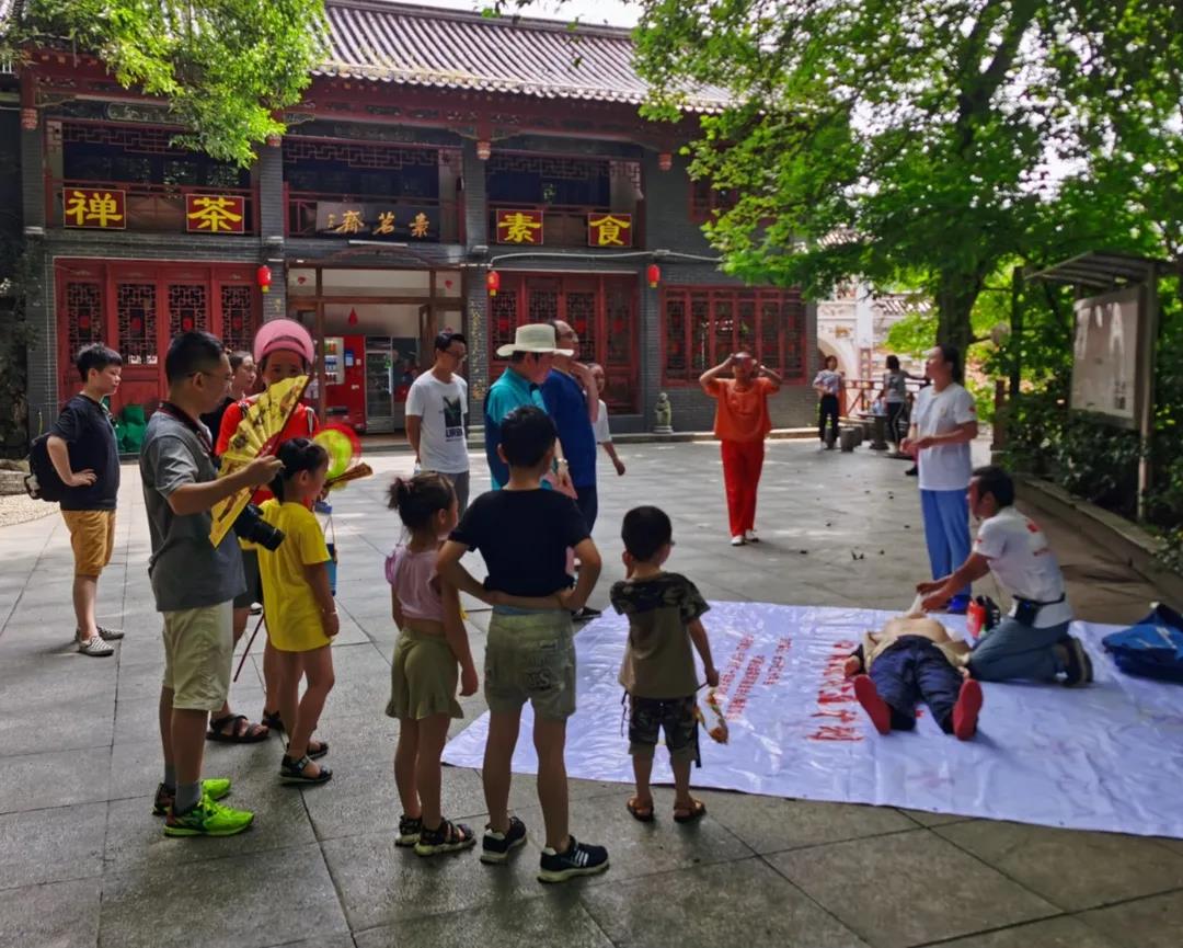 2020年6月13日上午10点,第2场“品素面,学急救”活动在麓山寺素茗斋门口、白鹤泉旁如期“摆摊”打卡,红十字救护师资、心唤醒讲师孙怀冬为本场“摊主”组长,其他“摊主”还有:急救侠刘思雅、急救侠夏天。由于周末,打卡“逛摊”人数比第1场要多不少,很多游客都亲自实操练习了,其中还有不少小孩子,甚至有的家长刚学完就协助孩子完成按压,咱们的各位急救侠“摊主”很有成就感。